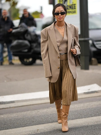 Чтобы избежать скучных образов, не забывайте про акценты — крупные украшения или минималистичные скульптурные формы в золоте. Благородный коричневый или глубокий карамельный идеально сочетаются с голубым и белым, поэтому освежайте многослойные аутфиты элементами холодных оттенков.