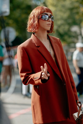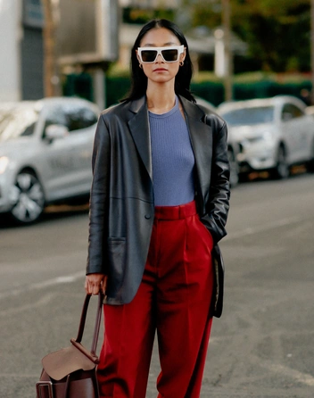 Самый востребованный материал осенне-зимнего сезона — кожа, будь то брюки, пальто или жакеты. Такие предметы гардероба всегда смотрятся эффектно, помогая превратить даже самый простой лук — в модный. Взять хотя бы за основу голубые джинсы и базовую белую футболку и добавить к такому сочетанию кожаный жакет свободного кроя. Получится трендовый лук в стиле любимых модных инфлюенсеров. Дополните такой аутфит мюлями или ботильонами с квадратным мысом и небольшой сумкой на плечо, а также завершите образ популярными очками-маской (читайте также: 5 самых модных моделей очков для осени 2022 года — носите их, чтобы преобразить любой образ).