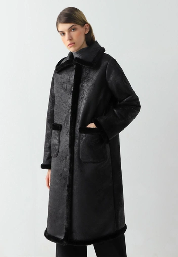 Как бы вам ни хотелось подчеркнуть талию и добавить образу женственности, делать это с помощью приталенной дубленки явно не стоит. Акцента на талии, а вместе с ним и элегантности поможет добавить свободный расслабленный образ, поэтому в качестве верхней одежды стоит отдать предпочтение удлиненному фасону прямого или оверсайз кроя, прикрывающего бедра. Такая дубленка зрительно вытягивает силуэт и стройнит фигуру.
