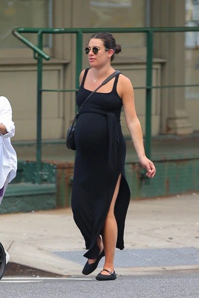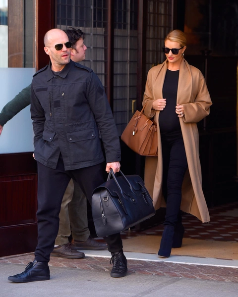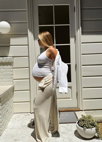 Роузи всегда верна минимализму и бежево-темной палитре, так что не удивительно, что она не отказалась от принципов и во время беременности. К тому же, это модно — хотя мы и говорим о спаде тренда на тихую роскошь, образы в этом стиле продолжают выглядеть актуально и присутствуют на показах Hermes, Fendi и Calvin Klein Collection. Однако old money еще не равно скромность, ведь модель не стеснялась облегающих фасонов и высоких разрезов (читайте также: Очки на пол лица, тихая роскошь и еще 6 секретов стиля Роузи Хантингтон-Уайтли).