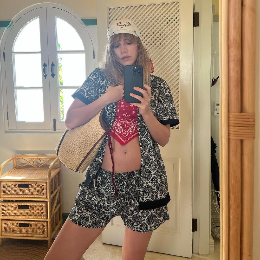 Образы Сьюки Уотерхаус идеальны для вдохновения перед поездкой на море — ее социальные сети полны стильными пляжными луками. Например, с купальником — тренды 2025 года рапортуют, что цветочные принты будут в моде в раздельном силуэте, который актуальнее слитного. Интересен и образ с шортами и рубашкой, который дополнила бандана — ее Сьюки повязала в стиле топа, как делают все it girls в 2025 году (читайте также: Талия, шея, сумка: куда еще можно привязывать бандану — тренд 2025 год) .