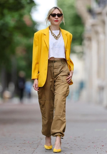Сочетание белого с желтым — классика. Тем не менее, при подборе оттенков нужно быть аккуратной. На фоне белого ярко-желтый может казаться грязным, пыльным. В комбинации с кристально-белым этот цвет потеряется и не будет выигрышно смотреться: он сам по себе светлый и рядом с еще более светлым оттенком не будет выглядеть насыщенным. В другом случае сочетание желтого и белого, наоборот, может создавать слишком яркий и выделяющийся образ. Если вам хочется комбинировать эти два цвета, лучше присмотреться к приглушенным, глубоким оттенкам: банановому, охре.