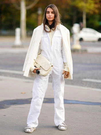 Белоснежные тотал-луки смотрятся элегантно и нежно, но нужно быть внимательной к подбору оттенков, так как соединить в одном образе один и тот же тон белого практически невозможно, за исключением полноценного готового костюма. Дело в том, что холодные и теплые оттенки белого друг с другом диссонируют, поэтому выбирайте что-то одно. А чтобы образ не выглядел плоским, добавьте разнообразие текстур: сочетайте кружево с хлопком, шелк — с денимом, кожу — с шерстью.