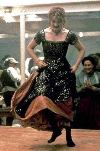 В этом фильме культовым, кажется, стало абсолютно все — от истории, актеров и украшений (кто не мечтал о кулоне в форме сердца?) до, конечно же, нарядов. Их в знаменитой картине немало, но мы уделим особое внимание кораллово-черному платью, в котором героиня Кейт Уинслет появляется во время обеда, а позже, сопровождаемая Джеком, выплясывает в каютах третьего класса.