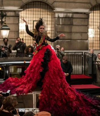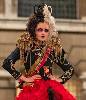 В этом наряде художница по костюмам и двухкратная обладательница премии «Оскар» Дженни Биван воплотила идеальное сочетание фирменного стиля Круэллы и атмосферы стиля панк-рок эпохи 70-х, которым пронизан весь фильм. В этой сцене золотые цепи и эполеты на милитари-жакете главной героини показывают нам, кто главный в модном мире. А шикарный шлейф из красной, черной и бордовой ткани добавляет королевского флера всему наряду. Вдохновением для красного платья послужило знаменитое платье «Tree» дизайнера Чарльза Джеймса.
