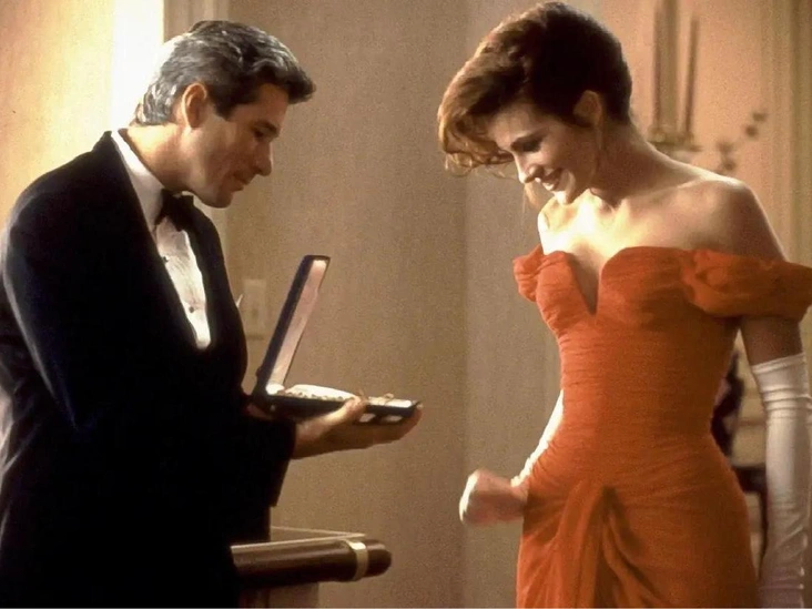 Сложно поверить, но алое платье стало предметом споров на съемочной площадке. Такой выбор наряда для рыжеволосой Джулии Робертс казался рискованным, и режиссёр Гэрри Маршалл даже предлагал заменить его чёрным. Но художница по костюмам Мэрилин Вэнс упорно отстаивала свой выбор: «Три платья были сшиты, прежде чем мы остановились на нужном оттенке», — вспоминала она. Спустя более 30 лет трудно представить Вивиан в другом наряде, и нет никаких сомнений в том, что выбор был сделан верно.