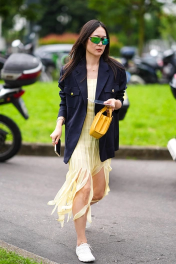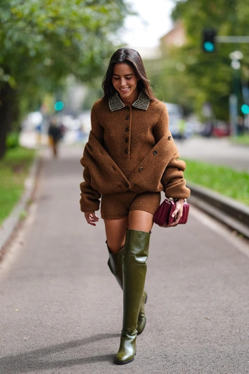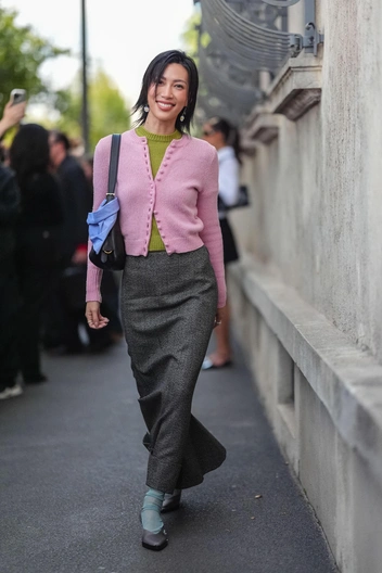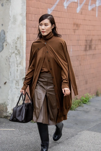 Сегодня история твин-сетов из трикотажа также остается актуальной. Другой важный момент — судя по образам инфлюенсеров с миланской Недели моды, сегодня актуальный трикотажный сет вовсе не должен быть с кардиганом и топом. Пару кардигану может составить водолазка, платье и даже другой кардиган.