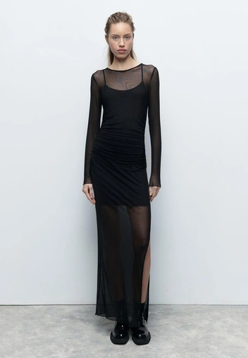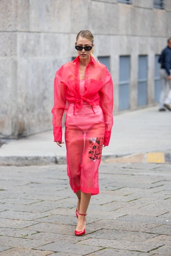 Эффект полупрозрачности в самых разных проявлениях правил подиумами и модными столицами 90-х. Тогда носили платья с эффектом нюд, сетчатые прозрачные лонгсливы поверх лаконичных топов и трикотаж в духе mermaid-core с расслабленной вязкой, напоминающей сети рыбаков (читайте также: 10 самых «голых» платьев звезд в 2024 году).