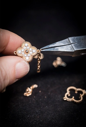Все украшения Alhambra, несмотря на обманчивую простоту, делают по тем же технологиям, что и самые дорогие шедевры высокого ювелирного искусства. Фрагменты камней, которым суждено превратиться в цветки клевера, полируются для достижения максимального сияния — естественно, вручную. Вручную же обрабатываются и золотые капли, обрамляющие каждый элемент украшения. В винтажных моделях золотой четырехлистник мог быть украшен бриллиантовым паве с камнями разного диаметра. Они крепились в открытую, напоминающую соты золотую конструкцию, что заставляло драгоценные камни блестеть ярче, а само украшение делало легче.