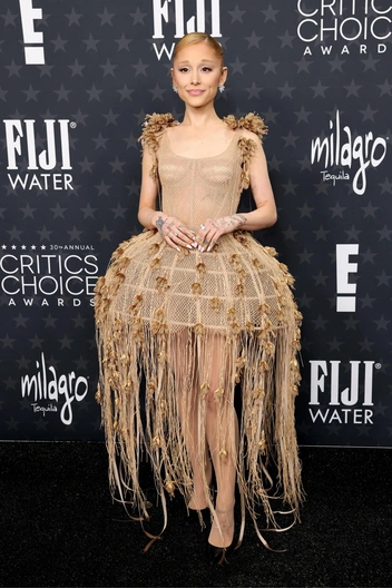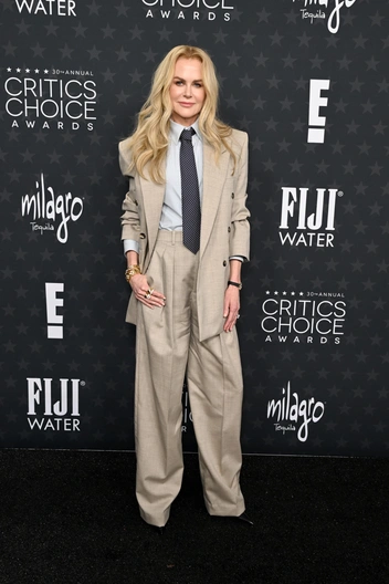 Кейт Хадсон, Наоми Уоттс и Наташа Лионн решили слиться с черной ковровой дорожкой, представ перед камерами в платьях того же цвета. Другие же звездные гости церемонии, не придерживаясь единого стиля, явно не побоялись экспериментировать со своими образами: Анджелина Джоли появилась в кружевном платье нюдового оттенка от Elie Saab из весенней коллекции 2025 года, Николь Кидман внезапно отошла от идеи платья в принципе и сделала ставку на пауэрдрессинг и офискор: оверсайз-костюм Saint Laurent. Ариана Гранде, которая (спойлер!) проиграла в номинации «Лучшая актриса второго плана», вслед за Джоли привнесла в Critics Choice Awards изюминку нюдового цвета, выбрав для церемонии платье-футляр с цветочными аппликациями и ниспадающей бахромой от Dior — певица, кажется, еще нескоро выйдет из амплуа доброй ведьмы Глинды.