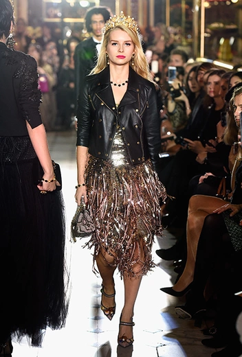 Юная Лотти Мосс вышла на подиум в золотистом коктейльном платье, черной куртке-косухе и с золотой тиарой в волосах.