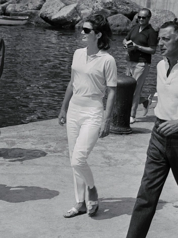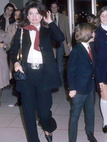В 1970-х миссис Онассис полюбила появляться на публике в брючных костюмах. Они отличались куда меньшей партикулярностью, чем костюмы Олега Кассини образца 1970-х, и отражали новый образ жизни бывшей первой леди. Жаклин умело сочетала их сатиновыми туфлями и сумками, нарядными ремнями и белыми блузами, дополняя богемные ансамбли неожиданным аксессуаром — галстуком-бантом.