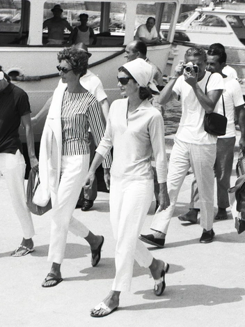 Сандалии Джека Роджерса сегодня считаются американской классикой, но их возникновение было бы невозможным без Джеки. После тщательно задокументированного папарацци путешествия первой леди на Капри в 1961 году она вернулась домой с сандалиями, которые купила в местной лавке. Обувщик из Палм-Бич повторил их дизайн для миссис Кеннеди в разных цветах — так и возник его собственный бренд. Та самая модель получила название Classic Jack и сегодня выпускается флоридской маркой в разных оттенках.