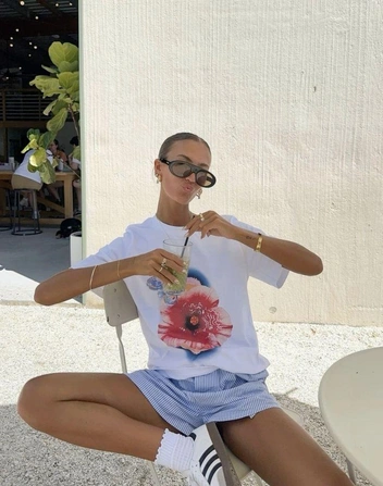 В социальных сетях много примеров того, как девушки носят укороченную футболку с шортами в пижамном стиле. Такие будут в моде летом 2025 года — в клетку виши, трендового голубого или желтого цвета. И особенно обратите внимание на шорты, похожие на боксеры: с выраженным поясом и длиной выше колена (читайте также: Капсула на лето 2025: 15 вещей, которые нужны вам для стильных образов).