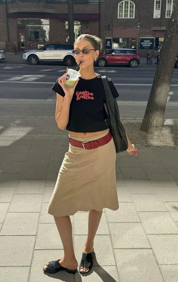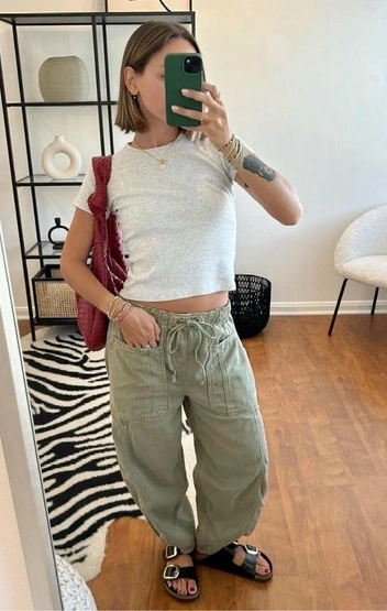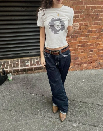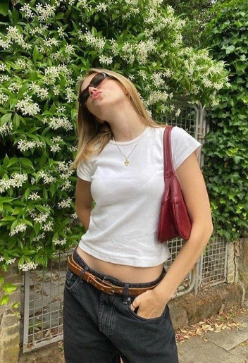 Поскольку baby tee это наследие нулевых, то низ в этом стиле будет смотреться гармонично. Джинсы скинни низкой посадки, брюки карго, кожаные брюки, вареные прямые джинсы в стиле Levi’s 501. Дополнить образ можно широким ремнем, бомбером и сумкой таксой — популярными айтемами в стиле нулевых.