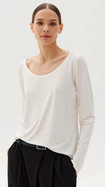 Если подобные полупрозрачные вещи не подходят вашему стилю жизни, тогда примерьте базовый лонгслив в нейтральных оттенках: бежевом, молочном, сером и черном — он будет эффектно смотреться как в монохромных минималистичных образах, так и в ярких, приглушая буйство красок. Миксуйте базовую кофту с разными по плотности тканями и фактурами, например, с кожей или денимом.