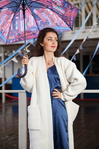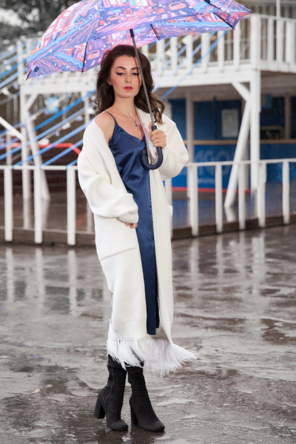 Я бы назвала этот образ простым и уютным. Он подойдет как для деловых встреч в отсутствие дресс-кода, так и для свидания или прогулки с друзьями. Ботфорты в данном случае завершают образ, а замша и бахрома отсылают нас к стилю бохо. Выбирайте любой цвет кардигана и зонта и делайте свой образ уникальным. Не советую сочетать все составляющие с классическими лодочками – получится несовместимый по составу набор ингредиентов.