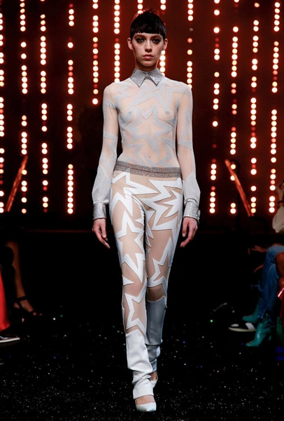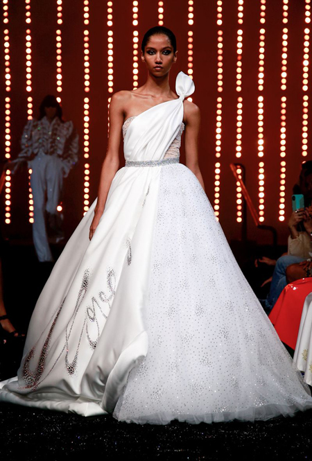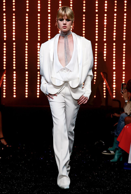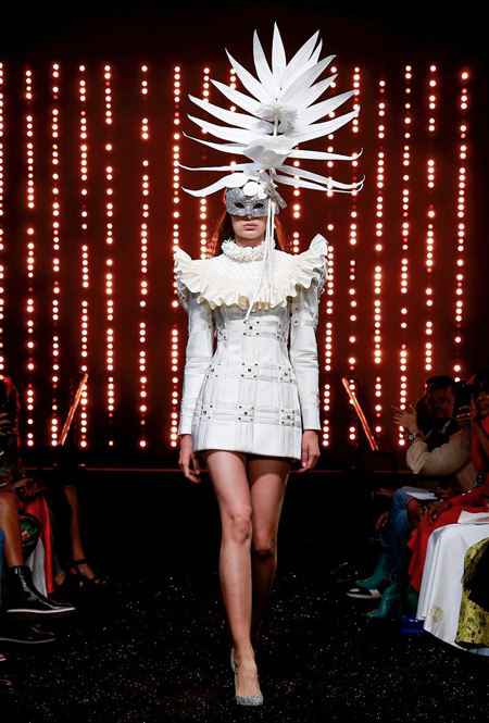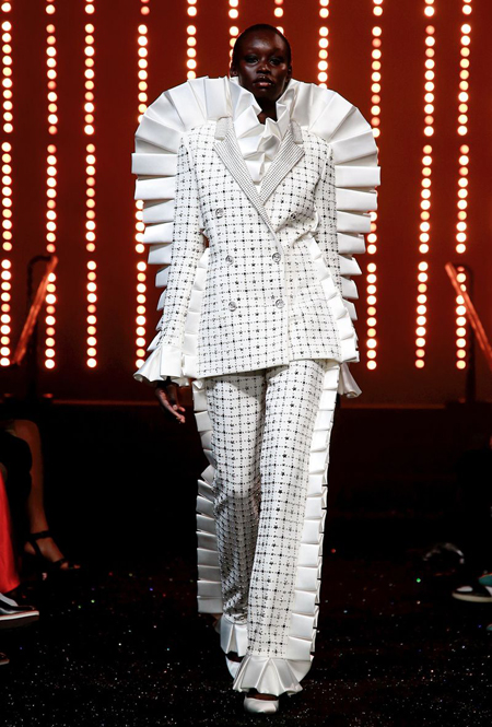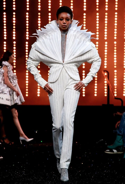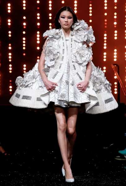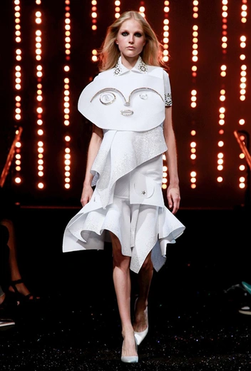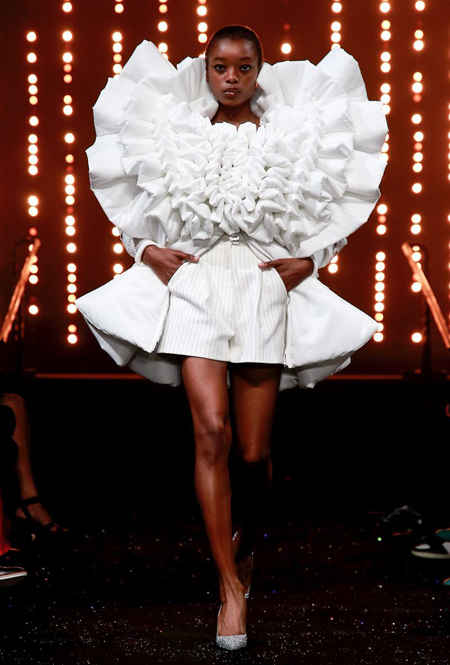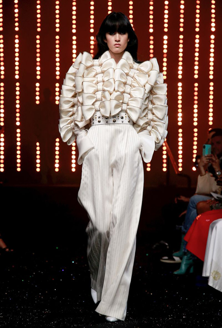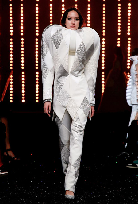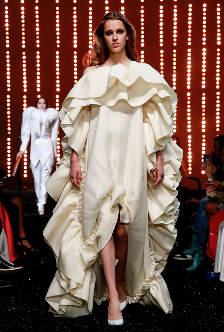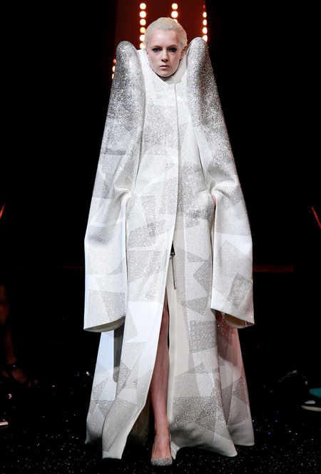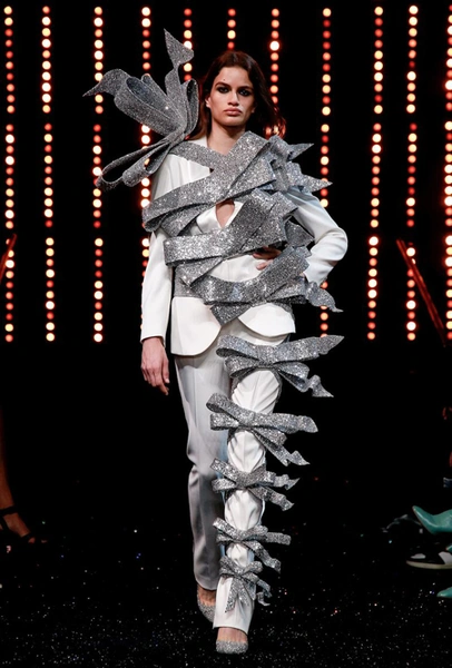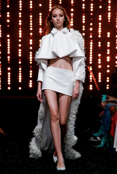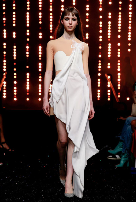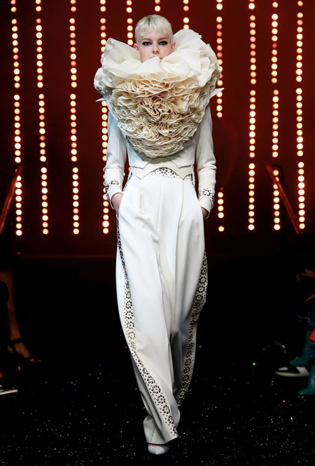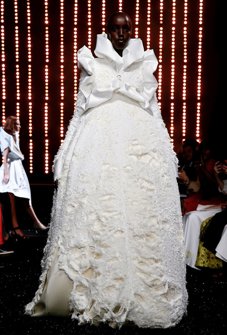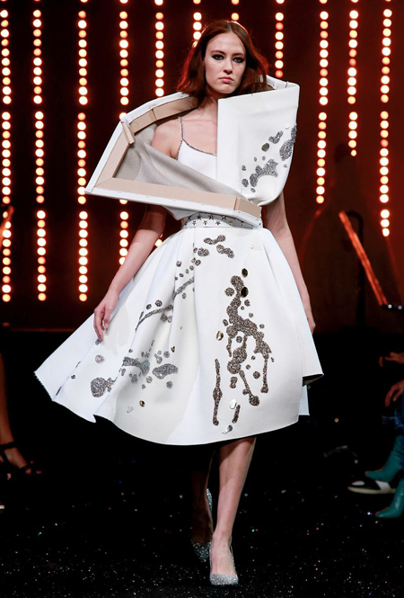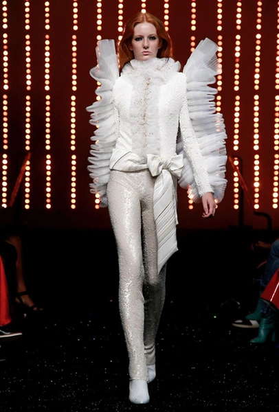 В юбилейной коллекции дизайнеры, как пытливые ученые, исследовали все возможные визуальные характеристики белой ткани. Где-то она выглядит похожей на морскую пену; где-то — напоминает полупрозрачный тюль, а где-то вызывает ассоциации с пластичным папье-маше. На некоторых вещах, впрочем, видны вкрапления серебристого и бежевого. Эти отдельные «точки на полотне» делают эффектнее и прекраснее всю картину.