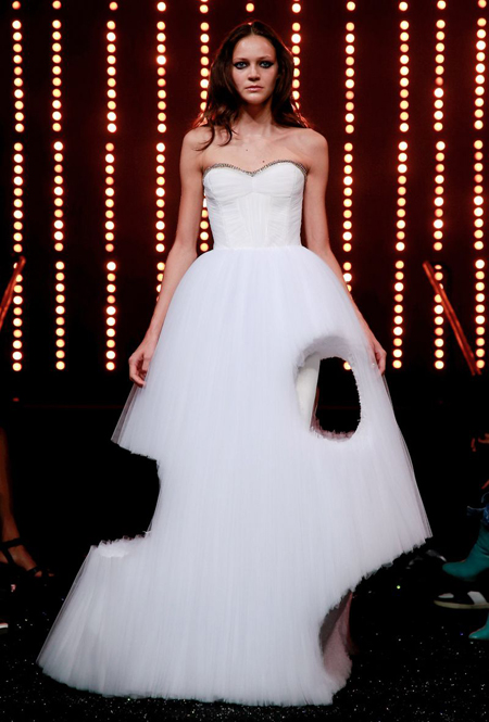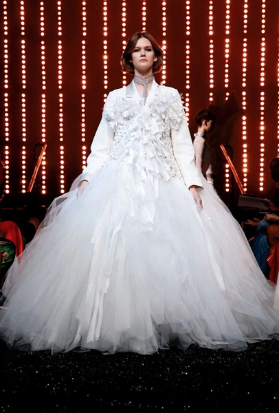 Белый цвет Виктор и Рольф всегда любили. Стоит сказать, что у них «в анамнезе» уже есть одна полностью белая коллекция couture (SS16) и четыре коллекции свадебных нарядов — разумеется, тоже белоснежных. Более того, с белым дуэт из Голландии работать умеет как ни один другой дизайнер. В прочтении Viktor & Rolf ткань цвета чистого листа бумаги каждый раз превращается в холст, на котором они «рисуют» очередное произведения искусства (не зря сами Виктор и Рольф называют себя не иначе как «fashion artists» — «художниками» от моды).