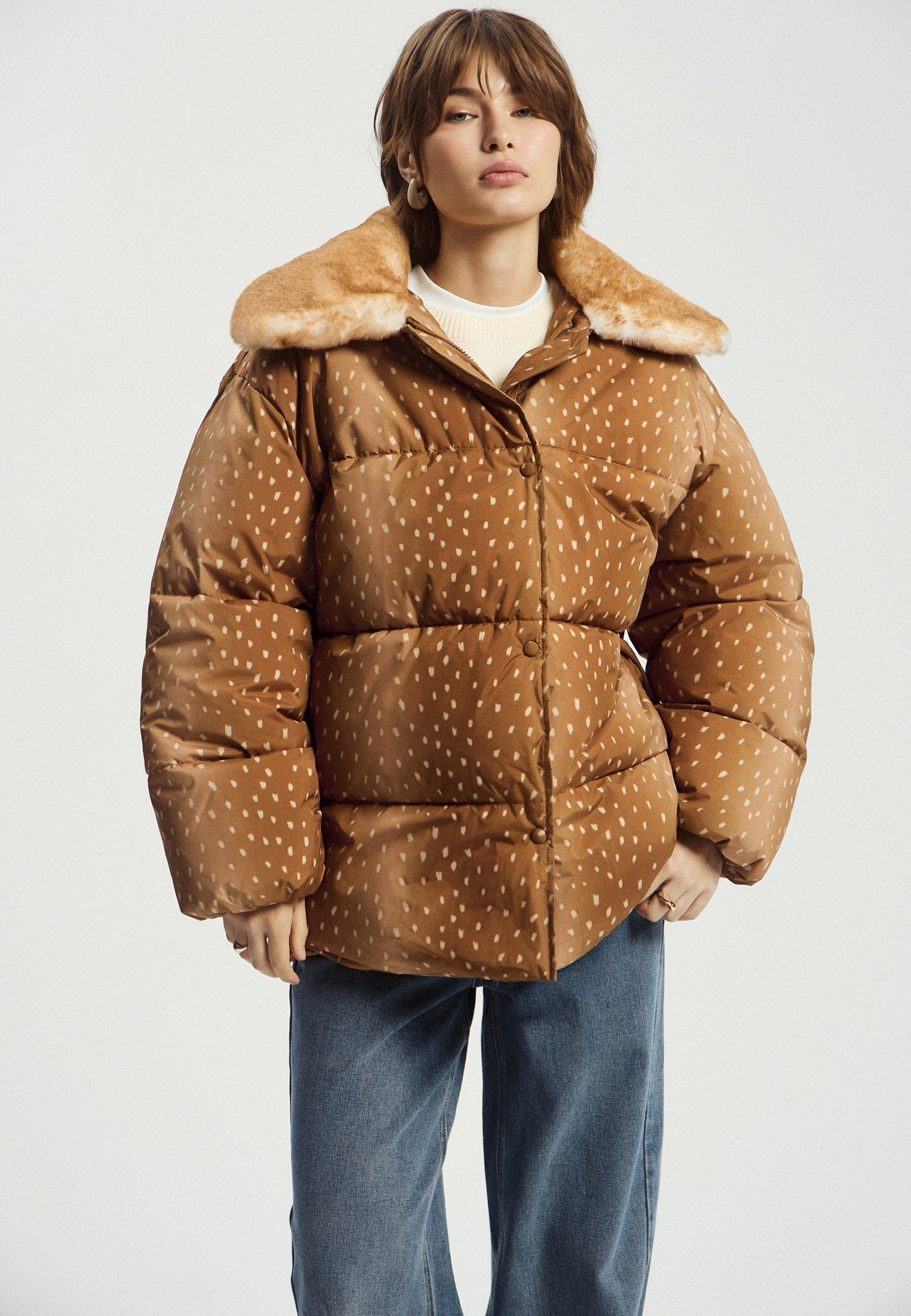 Носить этот принт можно точно как леопард — во всем, везде и сразу. Наиболее популярна сейчас верхняя одежда под оленя, особенно если материал имитирует мех. Благо, рисунок «Бэмби» менее «агрессивный», чем его хищный собрат, поэтому будет гармонично выглядеть даже на крупногабаритных вещах. Однако его столь же удачно можно использовать в виде аксессуаров — сумок, обуви, шарфов — чтобы разбавить сдержанные зимние образы.