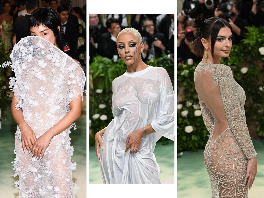 Какая же это ковровая дорожка, если хотя бы одна знаменитость не прошлась по ней практически в неглиже? Еще десятки лет назад представить наряды вроде мокрого платья Доджи Кэт или полупрозрачного Versace Эмили Ратаковски было уму непостижимо — даже бельевой стиль принцессы Дианы на Met Gala в 1996 году казался провокационным. А теперь диалог вроде того, который состоялся между Эмили и ведущими бала, вполне в порядке вещей: