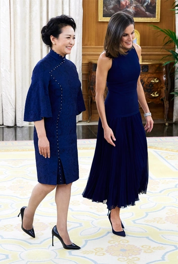 Ее стиль – больше элегантный, чем гламурный и яркий. В тот же день первых лиц Китая ждал торжественный ужин, организованный в их честь во дворце Сарсуэла – официальной резиденции королевской пары. По иронии судьбы наряды первых лиц Китая и Испании совпали по цвету: королева Летиция и мадам Пэн выбрали платья в трендовом оттенке индиго – на него, к слову, первые лица монарших семей делают ставку часто (читайте также: Почему герцогиня Меган полюбила темные оттенки синего).
