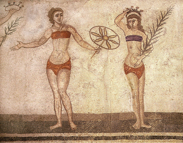 А на мозаике, созданной между III и IV веками, изображены римские спортсменки в одеждах, похожих на бикини. Они поднимают гантели, играют в мяч, бегают. Исследователи полагают, что тогда девушки использовали бикини в качестве тренировочной одежды.