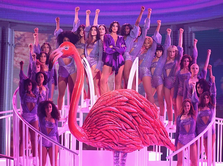 Что до самой церемонии, то она прошла без эксцессов. Дуа Липа превратилась в огромного розового фламинго, Кристина Агилера спела дуэтом с Деми Ловато, а самым ярким выступлением вечера, как всегда, стал номер Дженнифер Лопес — латиноамериканская дива в союзе с певцом Khalid исполнила песню Dinero («Деньги» на испанском — прим. ред.). Как это было — смотрите в нашем подробном фотоотчете!