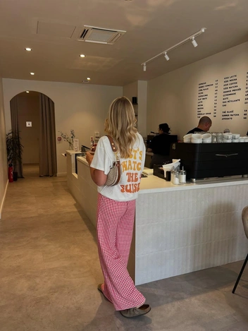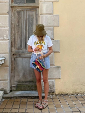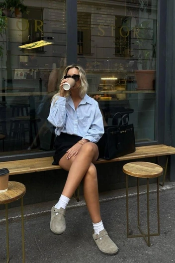 Или же брюками. Поскольку биркенштоки изначально носили именно дома, с ними можно составить расслабленный пижамный лук. На стритстайле брюки и шорты в полоску носят с модными baby tees и свитшотами (читайте также: Baby tee — самая трендовая футболка лета 2025).