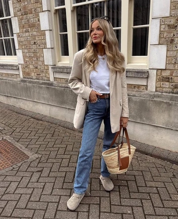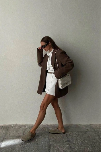 Бренды поняли, как популярны биркенштоки, а потому выпускают их не только в традиционном коричневом цвете. Можно найти голубые, зеленые, песочные, серые и многие другие оттенки, которые будет идеально стилизовать с чем-то такого же цвета. Проще всего тут, конечно, с бежевым — надеваем бежевый свитер или пиджак, и получаем продуманный аутфит без усилий.
