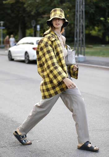 Если погода прохладная, никто не помешает накинуть на плечи более теплые предметы одежды и сочетать их с Birkenstock — такой образ будет смотреться эффектно.