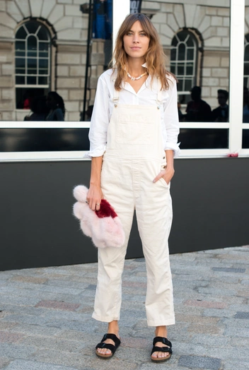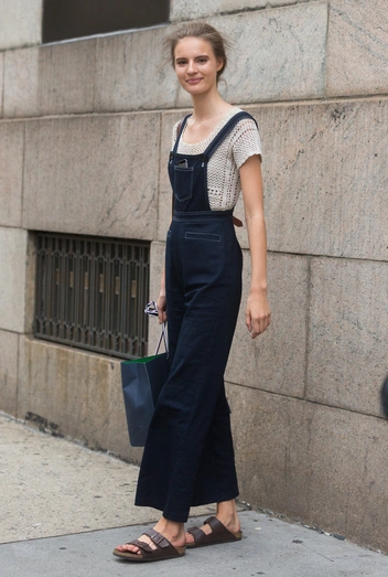 С любыми комбинезонами сочетание выигрышное. Простой, но стильный образ — модель в утилитарном стиле, простая кожаная пара Birkenstock и массивные аксессуары. Очень эффектное сочетание: белый летний комбинезон и белые, а лучше — серебряные, биркенштоки. Смотрится выигрышно и освежающе.