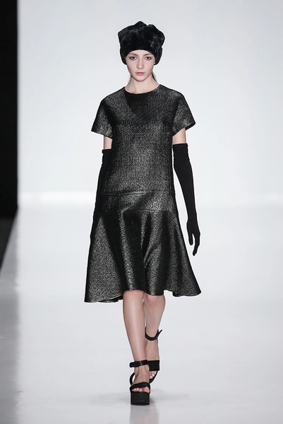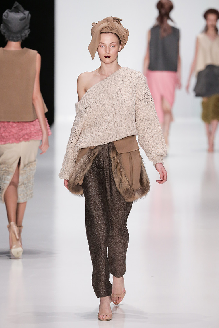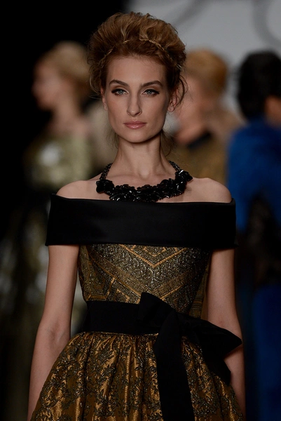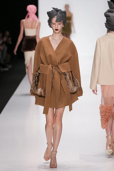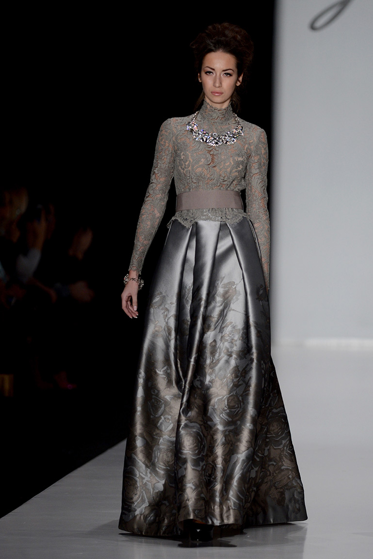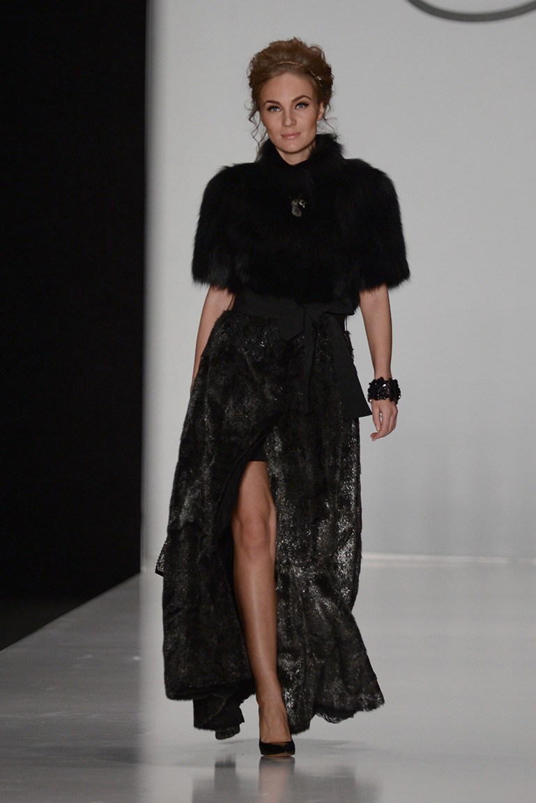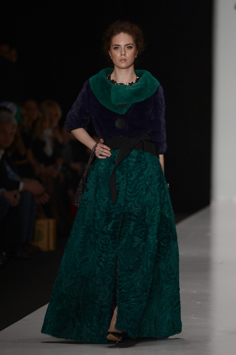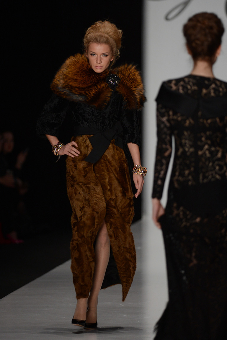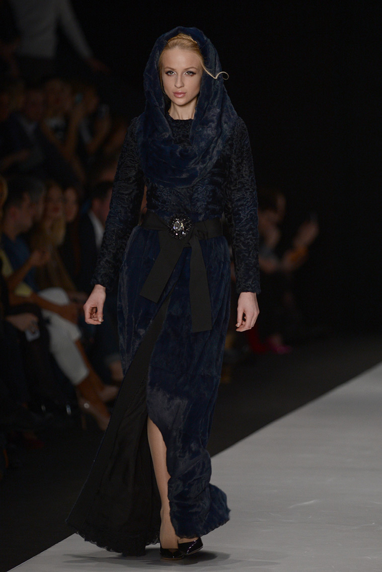 В коллекции дизайнера – платья, пальто, блузы и юбки, созданные из плотных тканей с вышивкой. В его нарядах кружево сочетается с атласом и мехом, который стал основным материалом коллекции. Цвета – изумруд, индиго, пурпур, бордо, бирюза, аквамарин и золото.