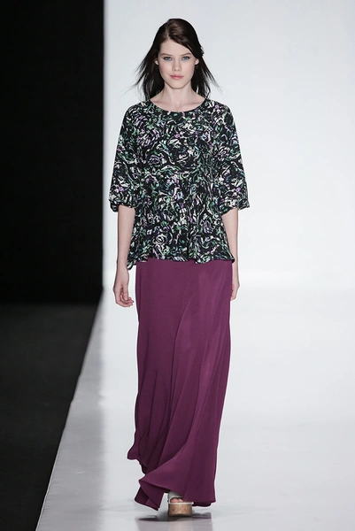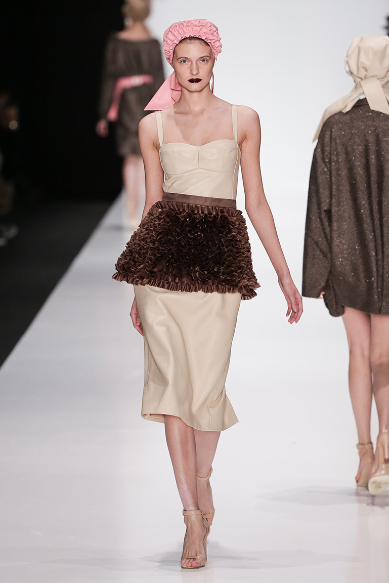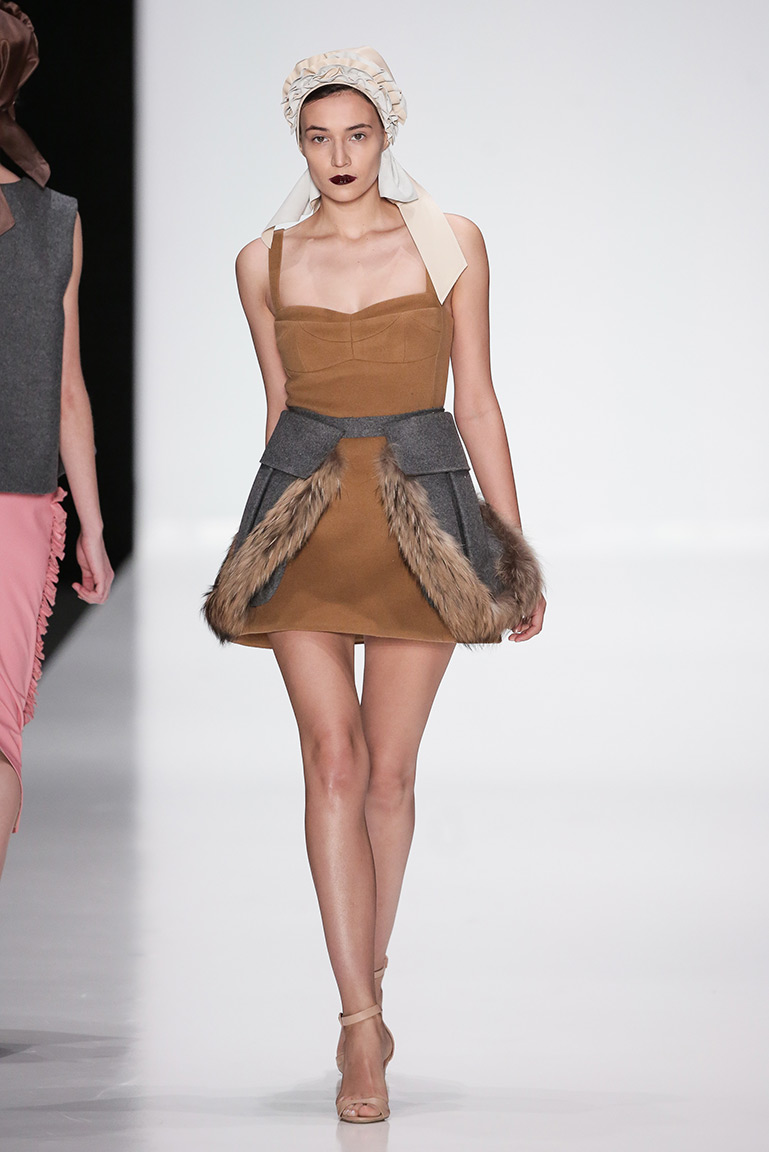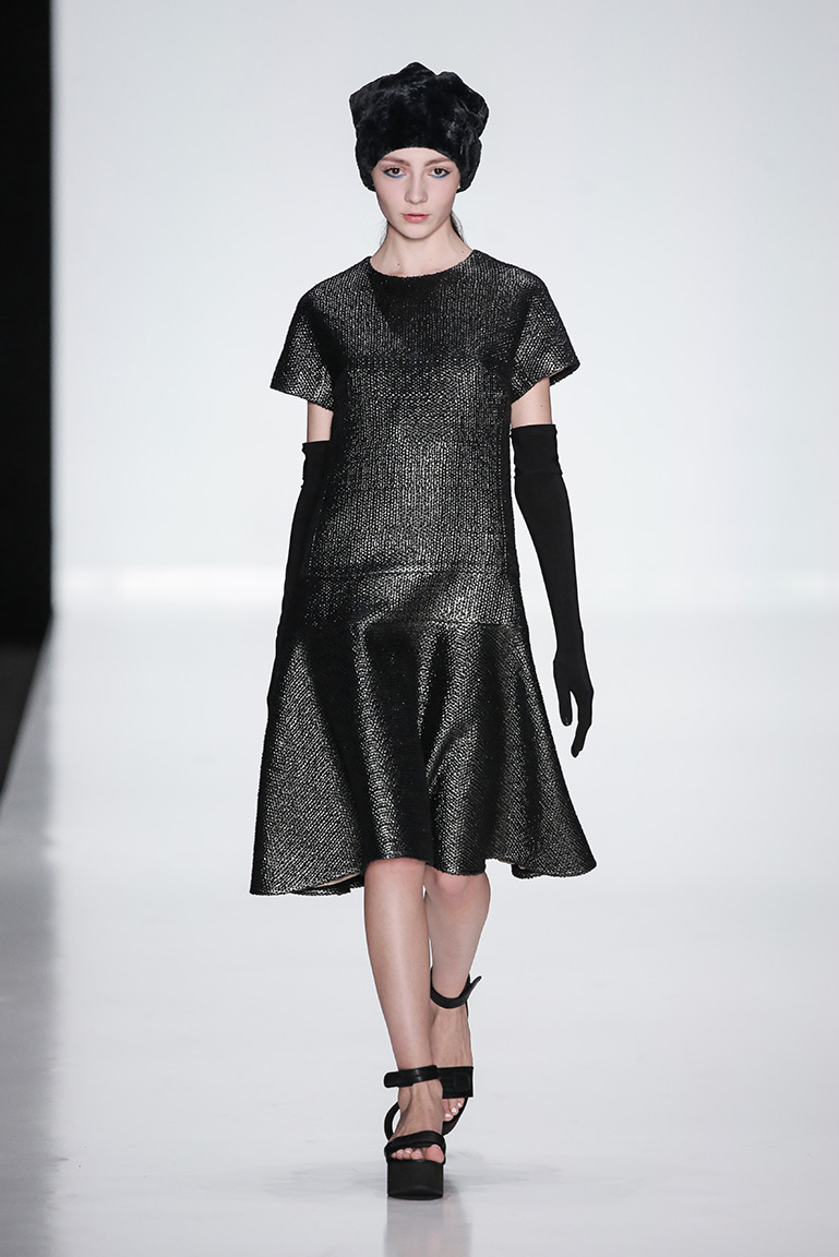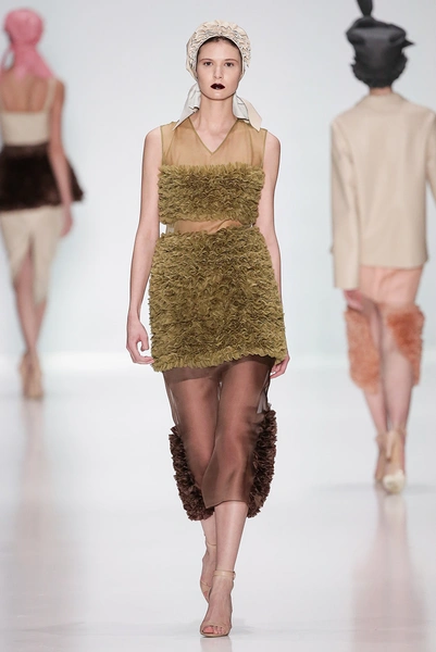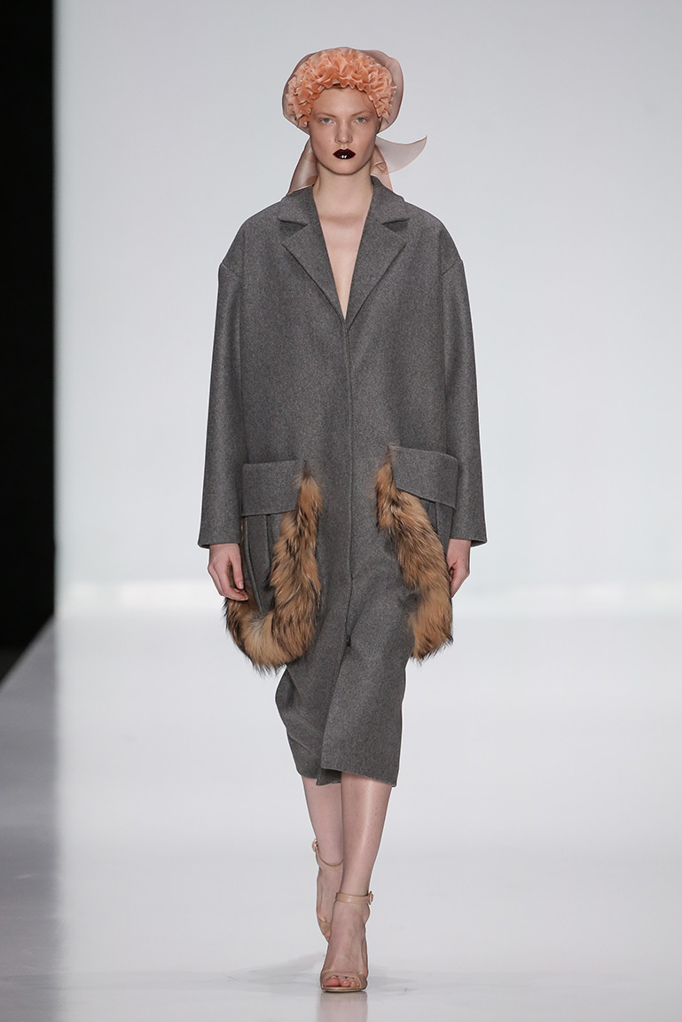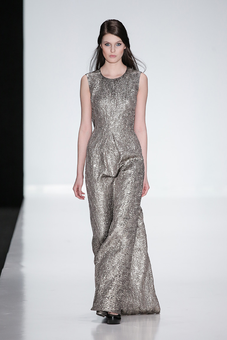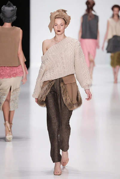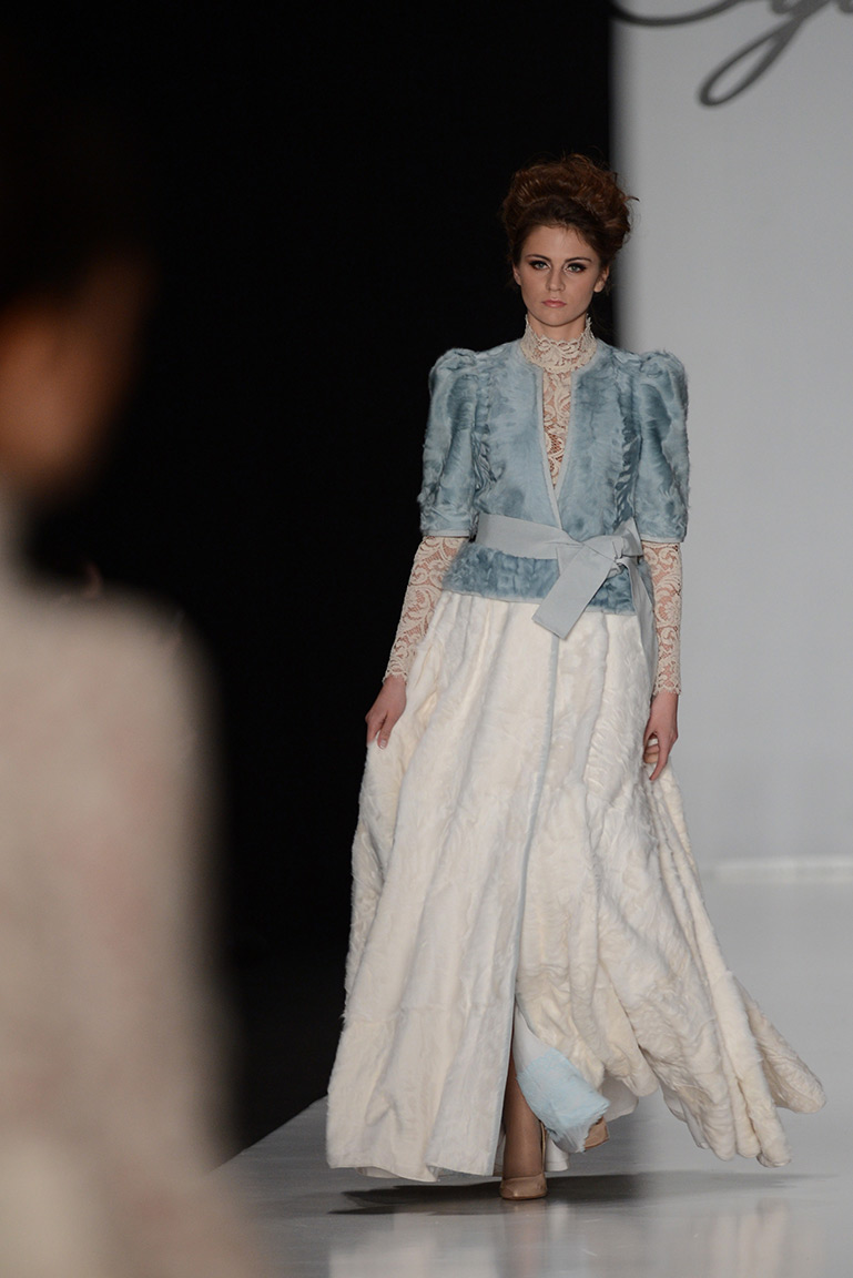 В коллекции дизайнера – платья, пальто, блузы и юбки, созданные из плотных тканей с вышивкой. В его нарядах кружево сочетается с атласом и мехом, который стал основным материалом коллекции. Цвета – изумруд, индиго, пурпур, бордо, бирюза, аквамарин и золото.
