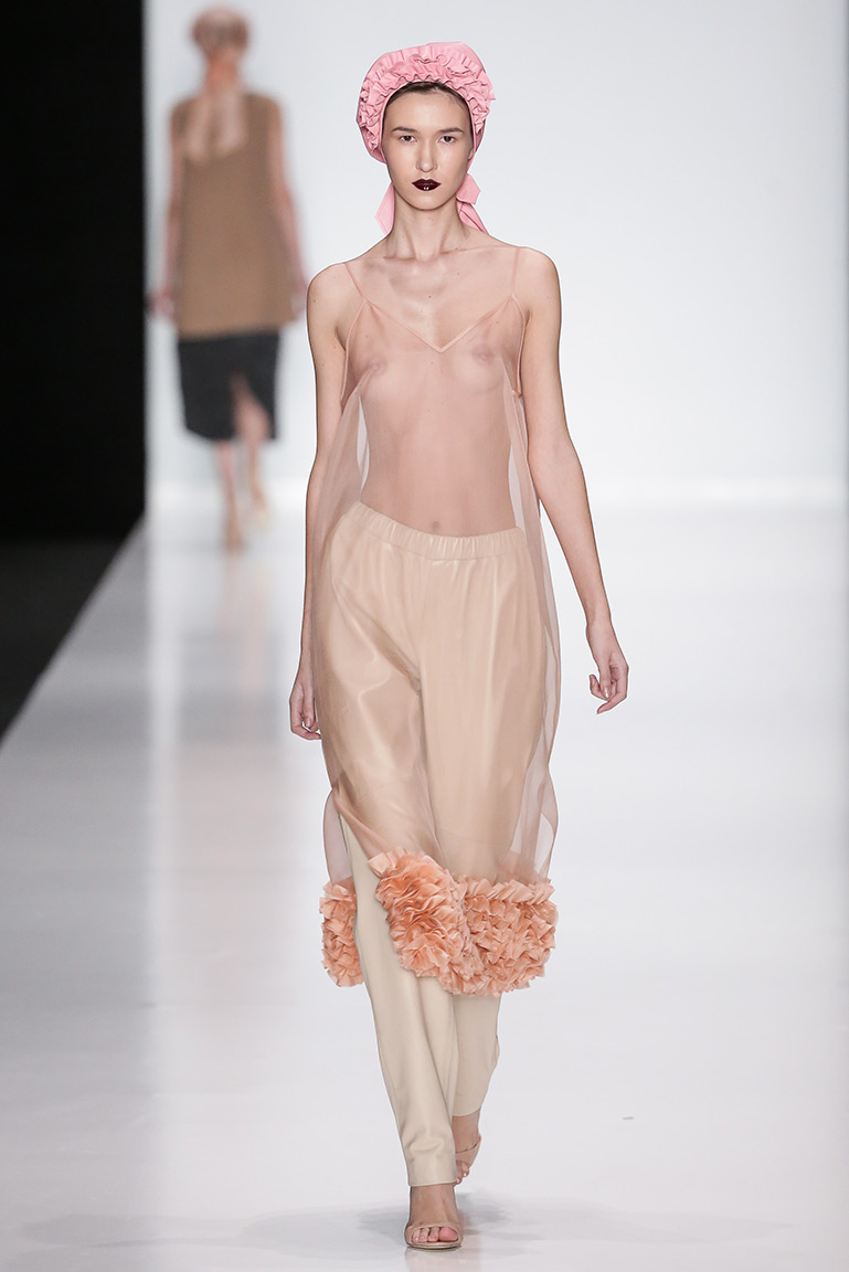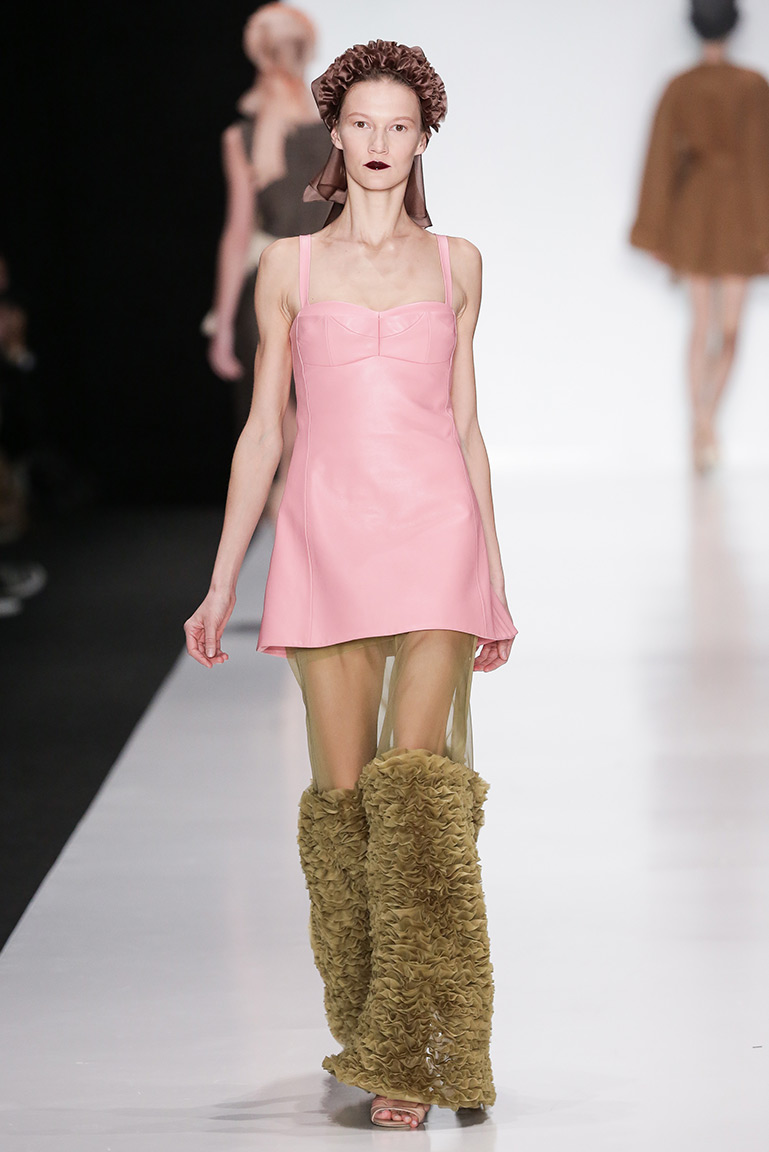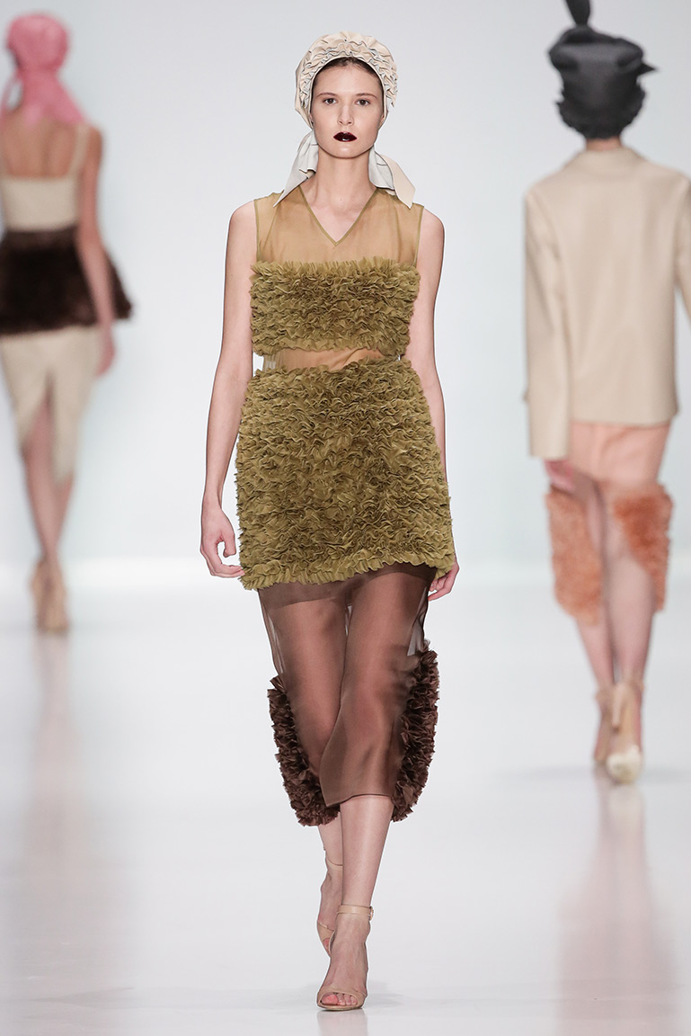 Ключевое описание новой коллекции Ruban – многослойность. Такого эффекта дизайнеры добились путем сшивания большого количества тонких полосок ткани из стеганой органзы в большом объеме. Новую методику опробовали на различных материалах, в том числе на жестком драпе и коже.