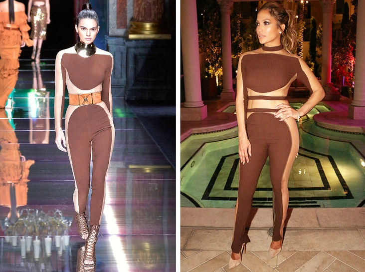 Дженнифер Лопес выбрала комбинезон от Balmain на свой 47-й день рождения, вдохновившись образом Кендалл Дженнер, которая представила модель на показе. Актриса и певица решила не изменять своему сценическому стилю и по случаю праздника выбрала костюм, в котором вполне могла бы появиться на своем концерте. Эффектный наряд Лопес дополнила замшевыми лодочками и почти незаметными украшениями. Для Кендалл стилисты подобрали ботильоны на шнуровке в стиле гладиаторов, широкий пояс и крупное металлическое украшение на шею. Благодаря фасону и цвету наряд одинаково выигрышно смотрится на любой фигуре. Ну а на Дженнифер он выглядит так, словно изготовлен специально по ее заказу.