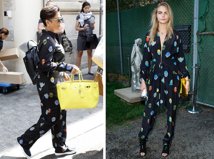 В таком образе Крис Дженнер выглядит, как настоящая мама шести детей — пяти дочек и сыночка, коей она и является. И не скажешь, что старшим детям уже больше сорока лет. Для перелета она выбрала комбинезон Stella McCartney и дополнила его комфортной обувью на плоской подошве. В качестве аксессуаров на ней графичные очки, пусеты, функциональный рюкзак и скромная желтая сумка Hermès Birkin для всяких мелочей, которые могут пригодиться во время полета (читайте также: Главная из Кардашьян: самые впечатляющие наряды Крис Дженнер). Кара Делевинь обладает несколько другими параметрами, поэтому муза Лагерфельда эффектно появилась в этом же комбинезоне на показе круизной коллекции Stella McCartney, превратив его в вечерний вариант с помощью ботильонов с открытым носом, золотого клатча и эффектного декольте, вытягивающего силуэт.