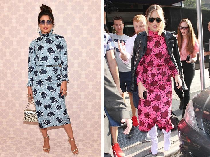 Оливия Уайлд и Приянка Чопра выбрали одинаковые платья от Kate Spade New York, но в разных цветах. Несмотря на различия фигур и внешности актрис, на обеих платье выглядит хорошо. Оно грамотно сидит в плечах и бедрах, а принт, даже при своей крупности, не полнит. Оливия подобрала к малиновому варианту сиреневые сапоги, а Приянка выбрала тонкие серебряные босоножки и стильные очки, которые перекликались с холодным оттенком платья. И такой морозный цвет интересно взаимодействует с восточной внешностью индийской красавицы, а малиновый, наоборот, придает яркости блондинке со светлыми глазами.