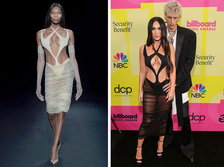 Звезда сериала Pose Доминик Джексон представила платье Mugler на сюрреалистическом показе весна-лето 2021. Актриса словно укуталась в тончайшую паутину цвета тумана. И кажется, что это не какой-то откровенный, почти прозрачный наряд, а выход инопланетянки в своем привычном образе. На Меган Фокс же платье смотрится совсем иначе. При своей контрастной внешности (темные волосы и светлая кожа) она выбрала модель в черном цвете, что подчеркнуло ее темный цвет волос. Ее рост несколько ниже, чем у Доминик, а платье опущено ниже колен до длины миди. Поэтому если на Доминик это платье выглядит, как ее наряд для ежедневной инопланетной жизни, то на Меган это очередной сексуальный образ на ковровую дорожку, пусть и очень эффектный (читайте также: Триумф Меган Фокс: как развод сделал актрису иконой стиля).