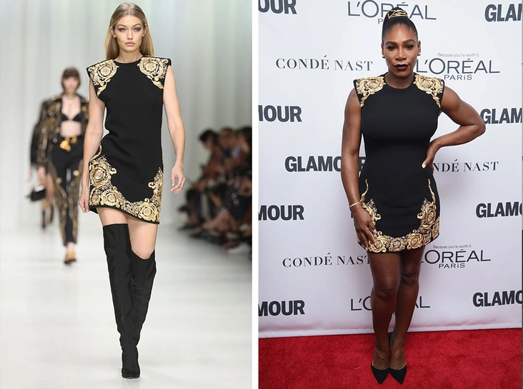 Джиджи представила платье на показе Versace. Платье с объемными плечами сидит на модели чуть свободно, но все так же чувственно, как и подобает итальянскому бренду. В дополнение стилисты выбрали черные сапоги выше колена и простую прическу. Серена же завершила образ черными лодочками и пучком. У теннисистки в силу профессии довольно широкая верхняя часть корпуса, но это нивелируется за счет объемных плеч, предусмотренных дизайном платья (читайте также: Гардероб Серены Уильямс: как одевается самая обсуждаемая теннисистка мира). Фигура спортсменки становится более пропорциональной, хотя платье сидит совсем иначе, нежели это было представлено на оригинальном показе.