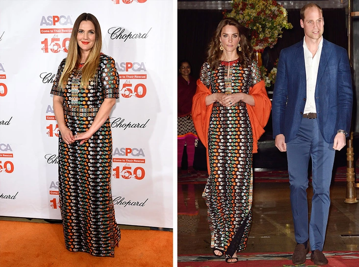 Одинаковые платья от Tory Burch актриса Дрю Бэрримор и герцогиня Кейт Миддлтон надели на разные мероприятия, проходившие в один вечер. Кейт придала формальности образу с помощью крупных серег, шали и босоножек на шпильках, а Дрю позволила платью говорить самому за себя. И все-таки на Кейт платье смотрится выразительнее, так как аксессуары подчеркнули фигуру и умерили пестроту узора (читайте также: Гардероб на миллион: самые дорогие наряды герцогини Кейт). А Дрю, наоборот, выглядит так, как будто она закована в платье. В нем отсутствует легкость — актриса словно накрепко прибита к полу, а пояс не подчеркивает талию, а фиксирует Дрю в недвижимом положении.