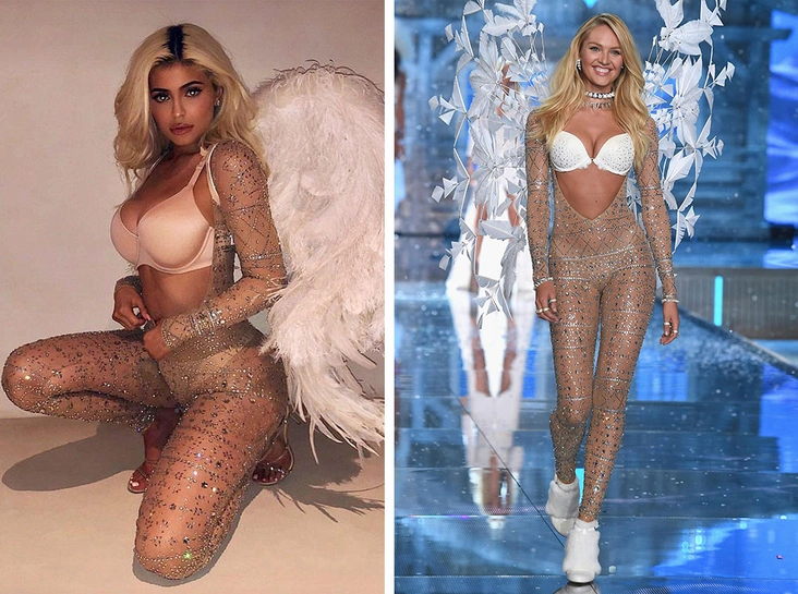Кайли Дженнер выбрала обнаженный костюм, усыпанный камнями, на одно из празднований Хэллоуина, когда все сестры Кардашьян-Дженнер нарядились в Ангелов. В тончайшем костюме сложно выглядеть по-разному, но Кайли за счет собственных форм придала ему большую сексуальность. И если Кэндис Свейнпол выглядела на показе Victoria’s Secret, словно Снежная Королева, или зимняя фея, то телесное белье и босоножки Кайли Дженнер убрали этот шлейф холодной таинственности.