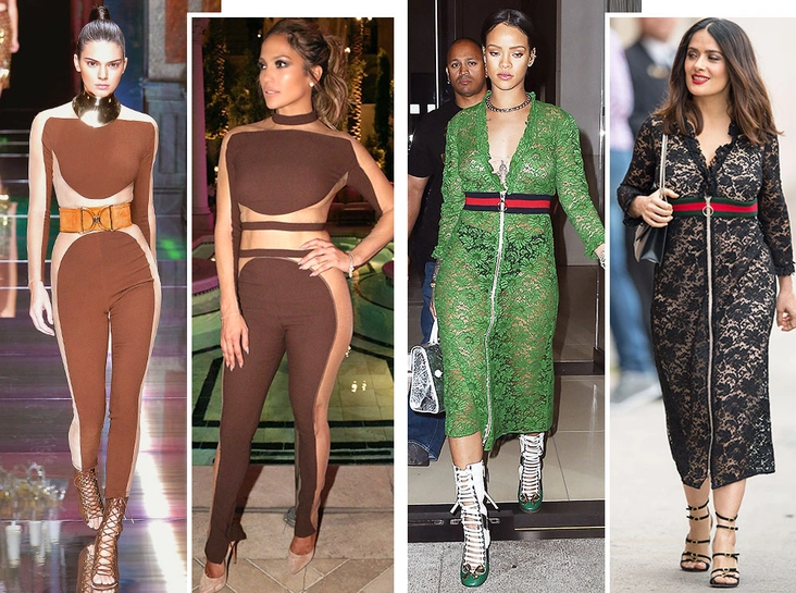 На удивление платье от Gucci оказалось таким эффектным и универсальным, что целых три совершенно разных стилю и внешности звезды выбрали его для своих выходов. Красотка Джулия Робертс остановилась на наиболее классическом варианте — зеленом платье Gucci, лоферах того же бренда и клатче. У Сальмы в образе присутствует испано-мексиканский колорит. У нее получилось создать драматичный, роковой образ, который она дополнила черным платьем и красной помадой. И несмотря на кажущуюся вычурность, на Сальме этот наряд кажется вполне подходящим и для выхода в свет, и для ежедневной рутины. Самый провокационный вариант позволила себе бунтарка Рианна — она убрала телесный слой платья и оставила лишь часть нижнего белья. Рианна, известная любительница красивого обнаженного тела, умеет соблюдать баланс в откровенности, поэтому на этот раз такую смелость она умело усмирила при помощи сдержанной прически, графичной серебряной сумки и сапог на шнуровке до середины икры (читайте также: Без стеснения: звезды, которые любят откровенные наряды).