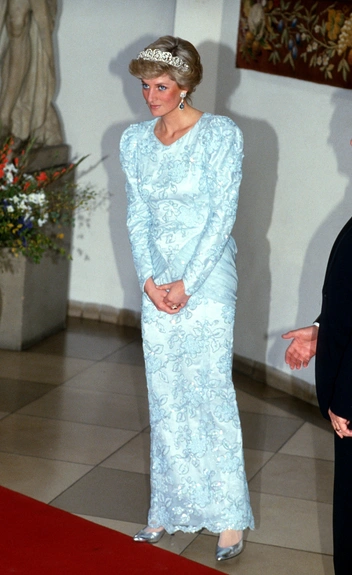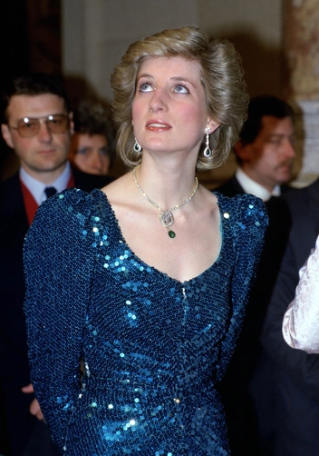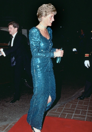 Принцесса Уэльская — настоящая королева пайеток. Все, что касается переливающихся вечерних нарядов — ее излюбленное поле для экспериментов Дианы. Чаще всего такие варианты готовила для нее один из любимых дизайнеров Кэтрин Уолкер. В гардеробе Уэльской было немало роскошных вариантов разных фасонов и цветовых палитр, но самым культовым до сих пор остается платье цвета морской волны в пол от Catherine Walker, которое она примерила для государственного визита в Австрию в 1986 году.
