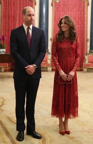 Не хуже получаются у нее яркие и красочные наряды, усыпанные переливающимися блестками. Например, алое платье миди от Needle and Thread, при помощи которого она завоевала сердца модных экспертов на приеме в Букингемском дворце в январе 2020 года.