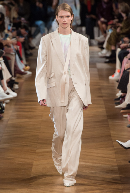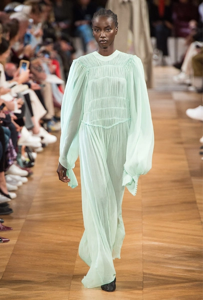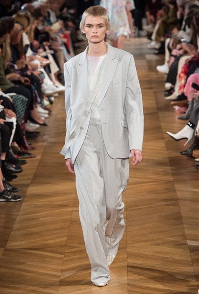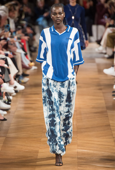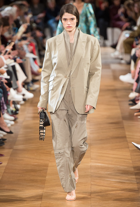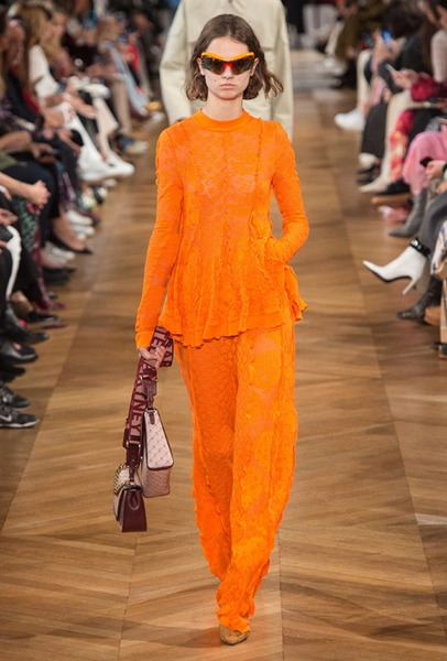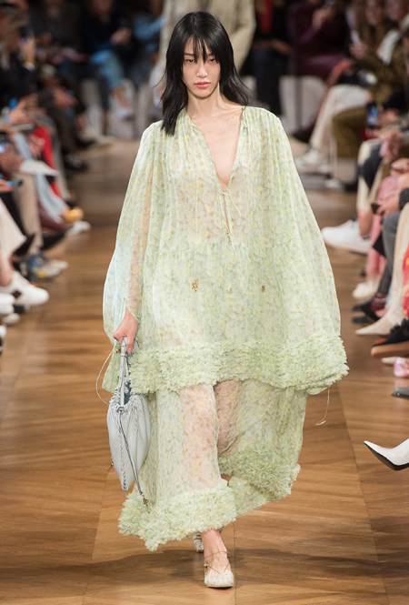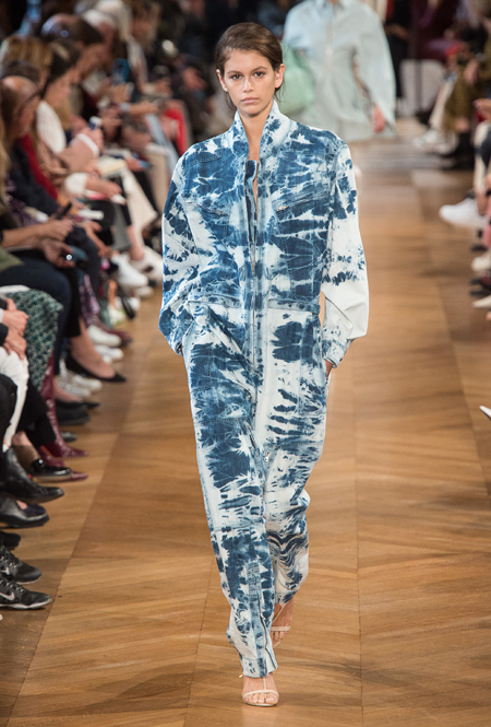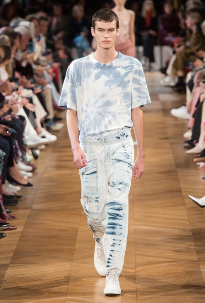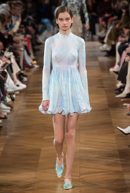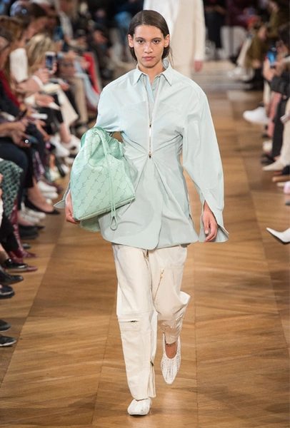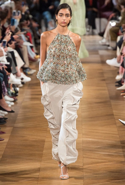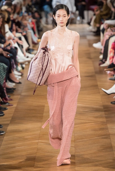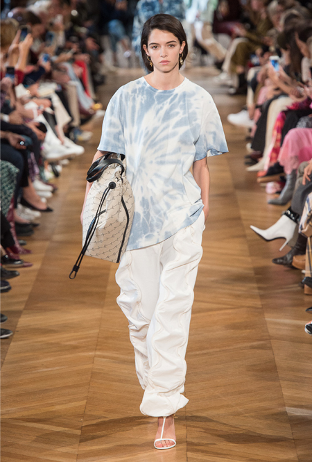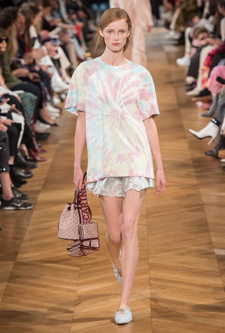 Нежный абрикосовый, бледно-васильковый и мягкий фисташковый — в новом сезоне Стелла Маккартни играет с разбеленными натуральными оттенками, выполняя в размытой цветовой гамме льняные оверсайз-костюмы, легкие кружевные топы из струящегося шелка и свободные трикотажные брюки. Даже принт тай-дай, позаимствованный у хиппи 70-х и переживший в этом году второе рождение, у бренда не такой яркий и полноцветный и напоминает, скорее, легкие акварельные разводы на футболках и топах. Однако такие оттенки совсем не выглядят тускло и уныло — в пастельной палитре ярче проявляют себя фактуры и объемы.