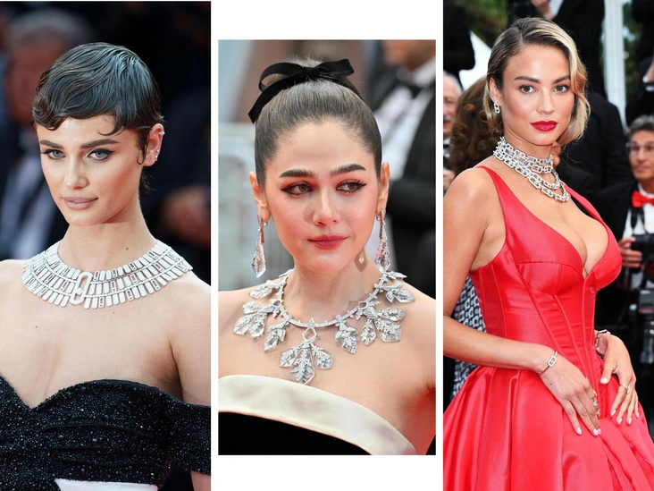 Дорожка Каннского фестиваля считается одной из самых престижных, поэтому ювелирные дома не скупятся и отдают звездам свои лучшие украшения. В этом году лидировали изделия из бриллиантов разных форм и огранок — и особенно нас поразило колье Messika на шее модели Тейлор Хилл. Не уступила и тайская актриса Арая Харгейт, которая показала целых два крупных колье Boucheron с огранкой в форме листьев.