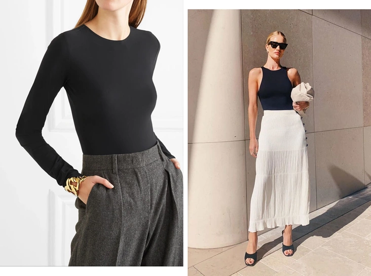 Несмотря на то, что с годами трендовые модели боди претерпевали изменения, сейчас лучше делать ставку на облегающие и нейтральные варианты, которые станут идеальной основой для образов на каждый день. Делайте выбор в пользу сдержанной палитры — бежевого, оливкового, черного, белого или пыльно-розового. Именно они оказались особенно популярны среди дизайнеров и модных звезд-инфлюенсеров, которые научились строить вокруг них актуальные повседневные образы.