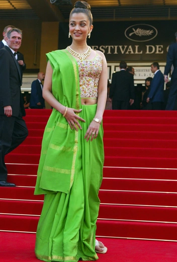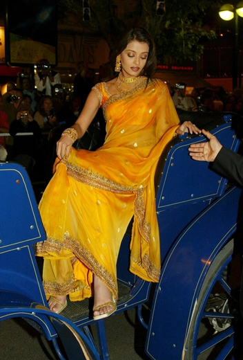 В свой первый приезд Айшвария позировала в желтом сари. Через год Рай появилась на фотоколлах и премьерах уже не в национальной одежде, но в нарядах, где индийский колорит все равно считывался моментально: желтый наряд с брюками и сложное двухцветное платье Айшварии — тому подтверждение.