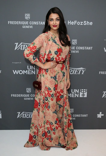 В 2015-м Айшвария Рай приняла участие в панельной дискуссии, посвященной правам женщин. Естественно, что ее платье оказалось не таким роскошным, какие она обычно выбирает для красных дорожек, однако изменить себе и совсем отказаться от ярких акцентов актриса не смогла.